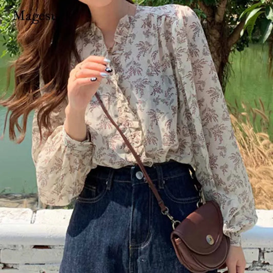 Autumn Sweet Slim Chiffon Blouse Women Puff Sleeve Korea Women Tops and Blouses Cardigan Print Floral Women Shirts Blusas 10314