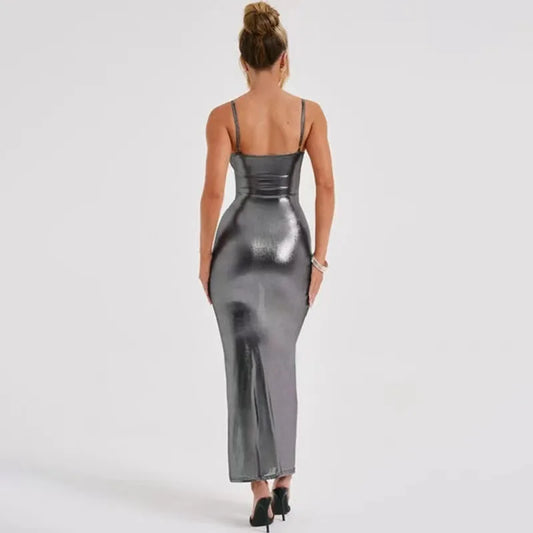Abrini Women Solid Bodycon Dress Metallic Sleeveless Spaghetti Strap Maxi Dress Backless Evening Party Dress Sexy Vestidos